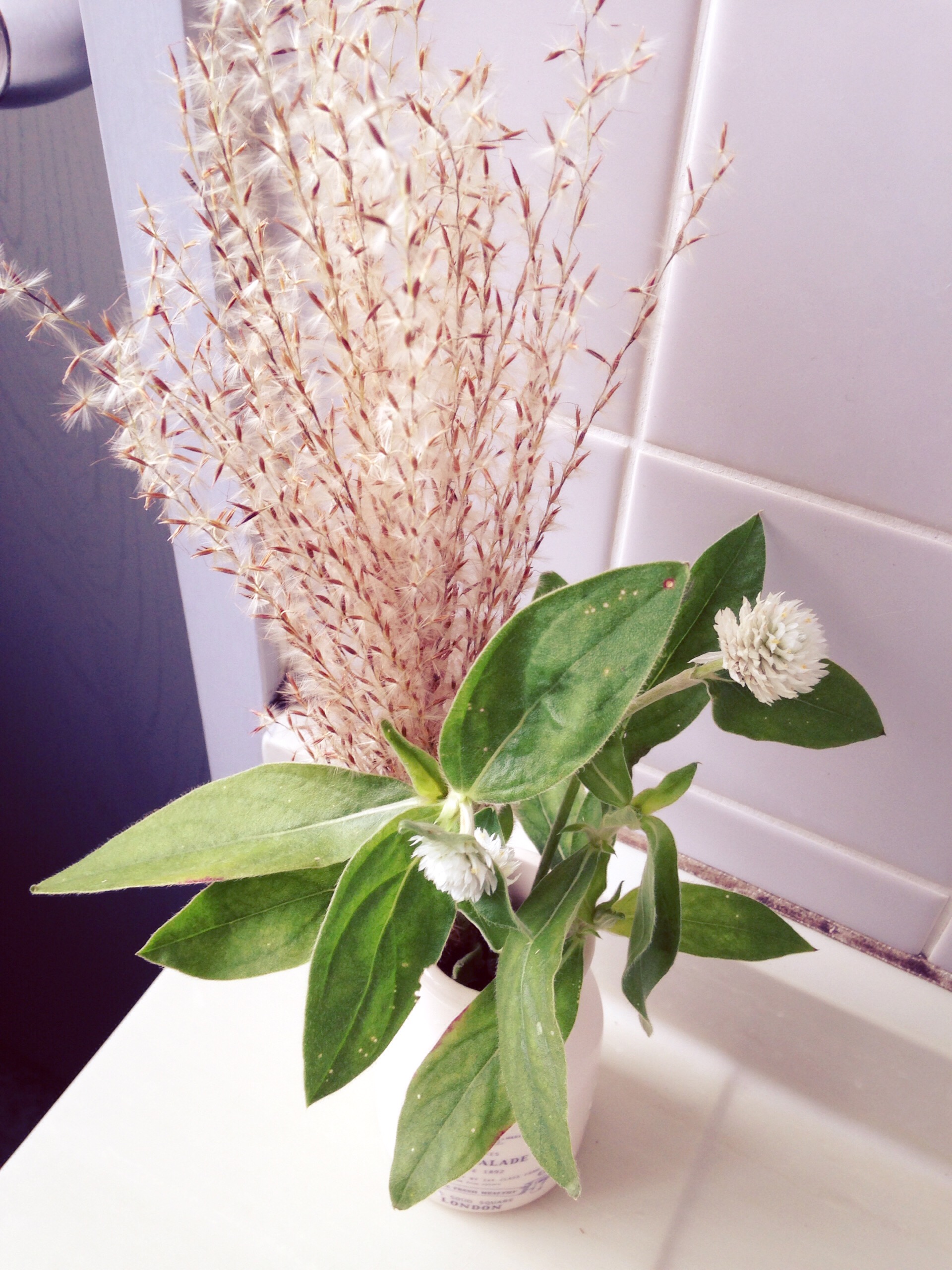 玄関にはリンドウ、ガーベラ、千日紅(白)。洗面所にはススキと千日紅。