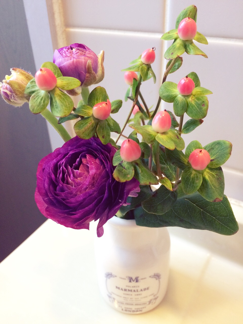 洗面所には、ラナンキュラス、ヒペリカム(実)です。