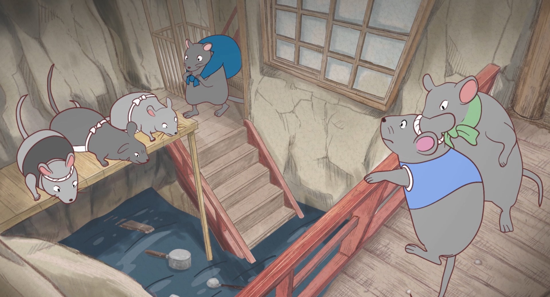 ある日の地震の後、ひとり出会った老ネズミから、じきに津波が来ると教わります。しかし、慌てず仕事を続けようとする先輩たちは信じてくれません。