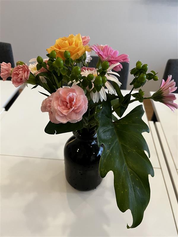 オレンジ・濃いピンク・ピンクなどカラフルなお花と大き目の葉でまとめてみました!