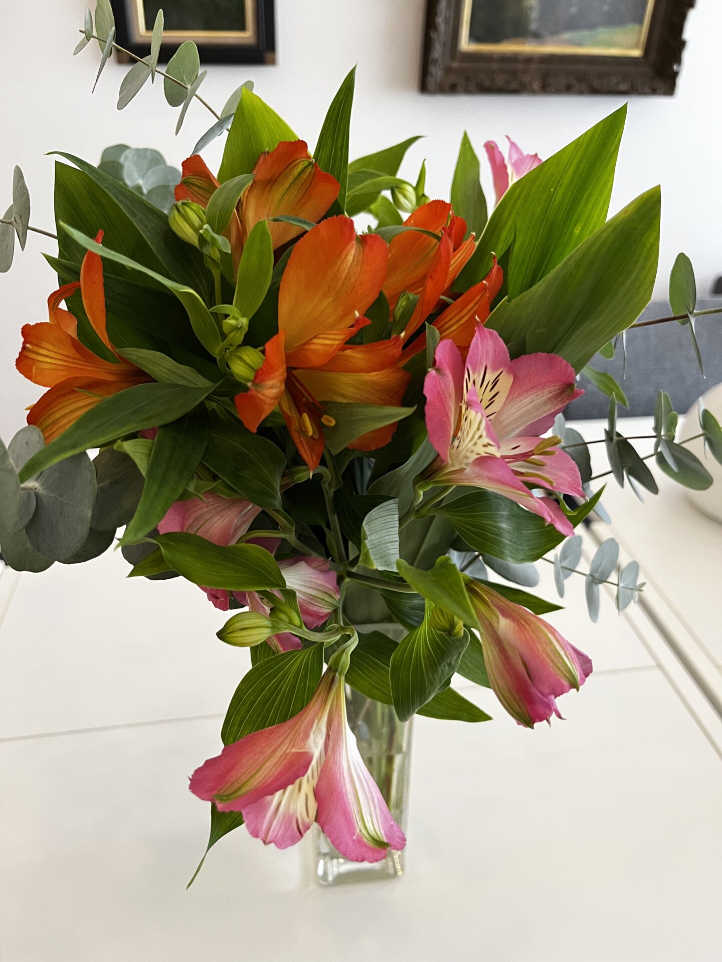 鮮やかなオレンジとピンクのアルストロメリアが主役の今週のお花は、空間をパッと明るくしてくれます。