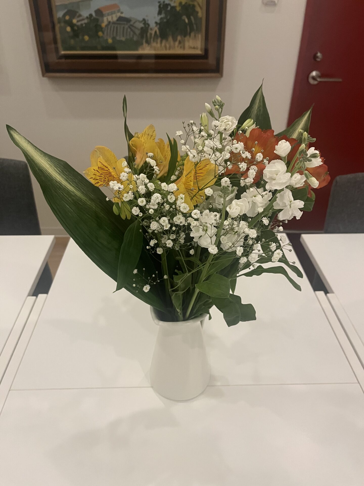ふんわりと咲く白いストックは、やさしい香りと上品さを添えてくれて、全体の雰囲気をやわらかくまとめてくれます。