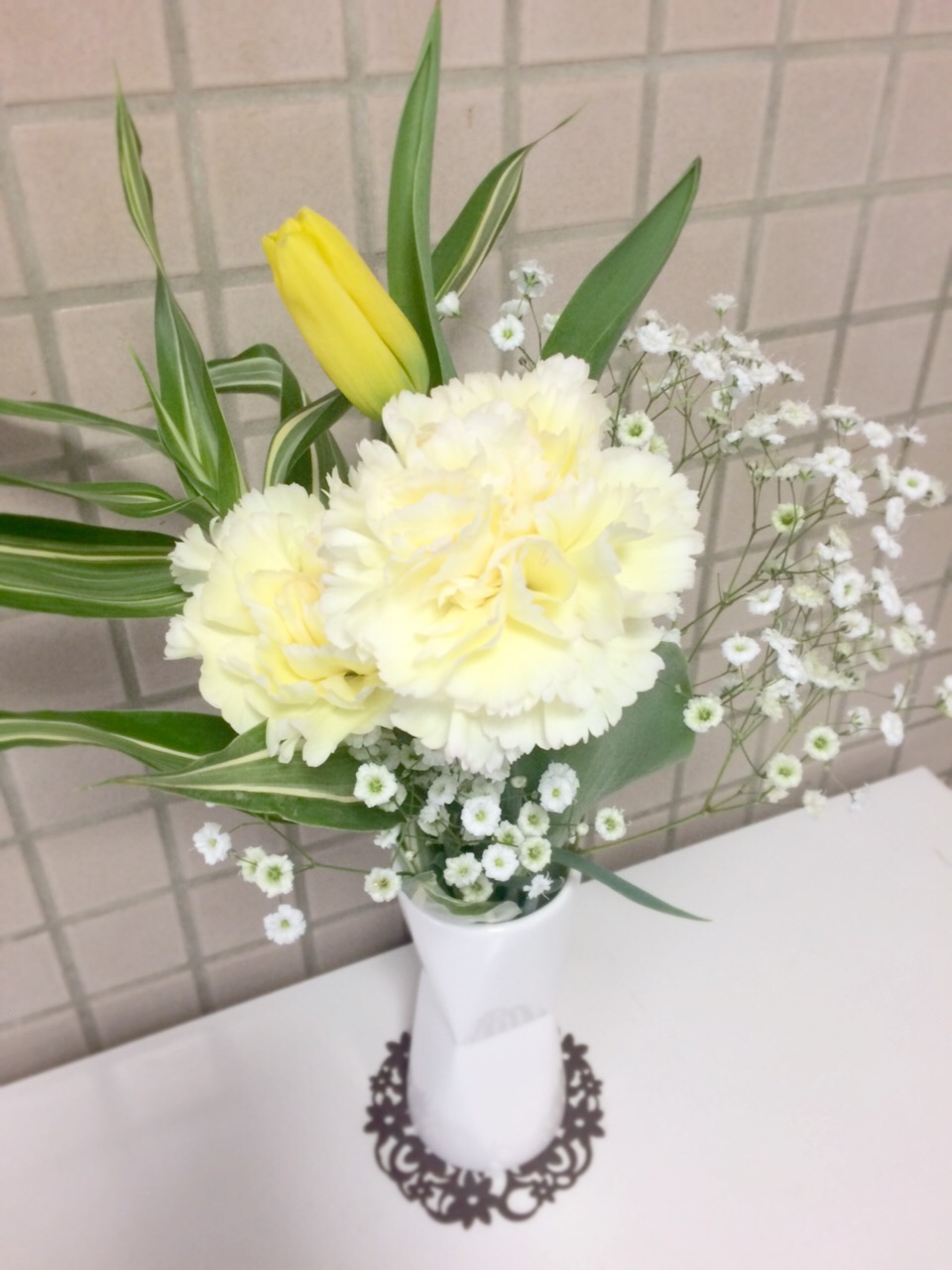 玄関には、カーネーション、チューリップ、かすみ草、ドラセナ(葉)。