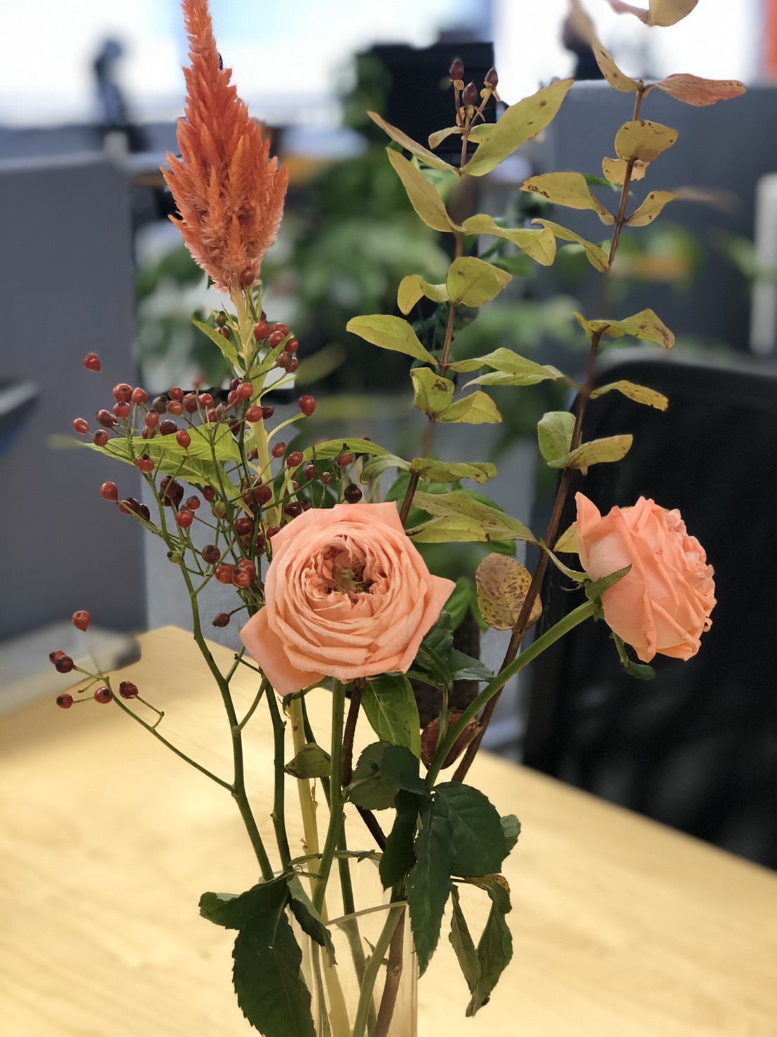 今週のお花は、❝バラ❞❝野ばらの実❞❝ヒペリカムの葉❞❝ケイトウ❞です。